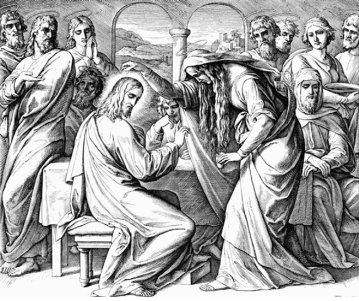 Женщина, помазавшая Иисуса миром в то время, как Он возлежал на вечери, у Иоанна отождествляется с Марией, сестрой Лазаря, у Матфея и Марка остается безымянной. Она помазывает драгоценным миром голову Иисуса, что вполне соответствует общепринятой практике. Необычным является то, что она разбивает сосуд: такая практика не подтверждается ни литературными источниками, ни археологическими раскопками. Женщина разбивает сосуд или потому, что спешит (боится, что ее прогонят?), или чтобы дать возможность маслу вытечь в большом количестве. Именно это вызывает недоумение и негодование учеников: зачем такая трата? Почему использовано столь много драгоценного мира?